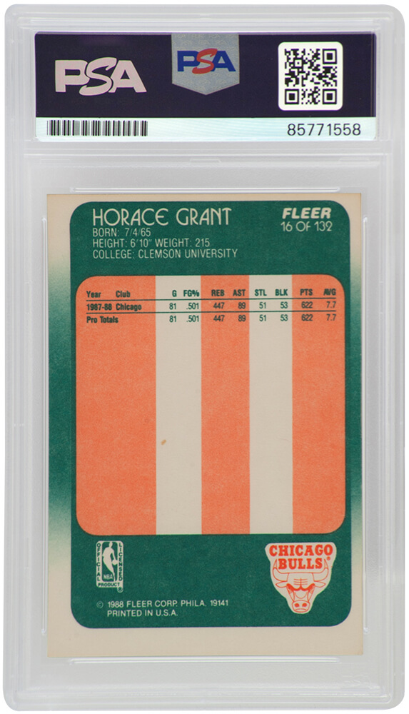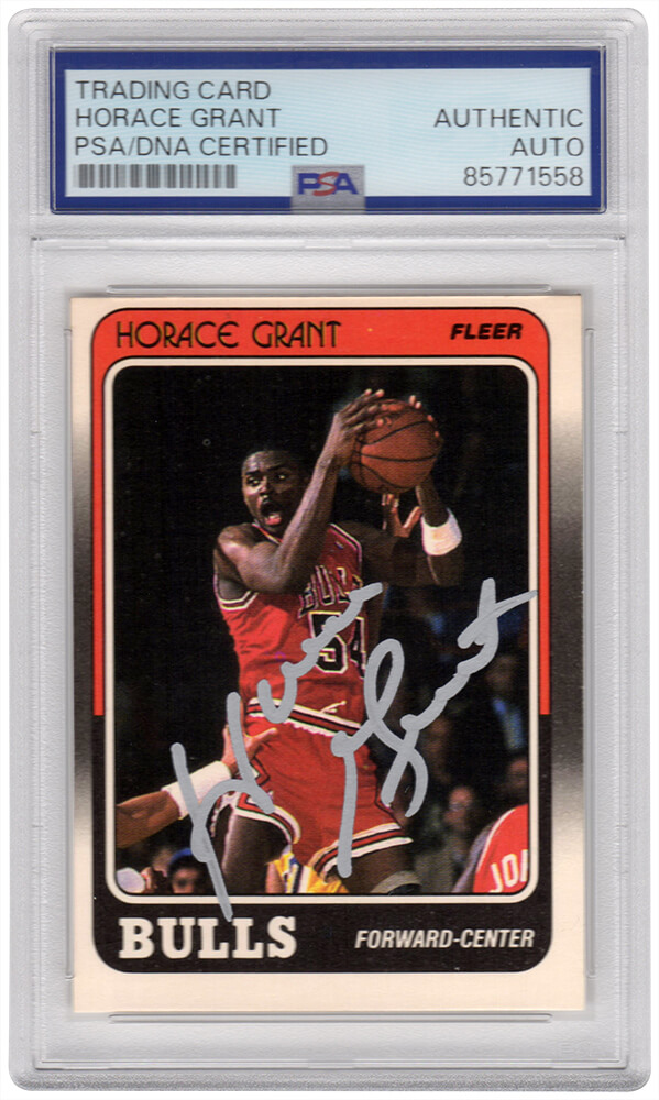 Horace Grant signed Chicago Bulls 1988 Fleer rookie basketball trading card #16. The card has been authenticated and encapsulated by PSA and the authentication number can be verified online.