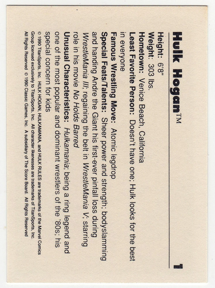 Lot of 7 – Hulk Hogan 1990 Classic WWF Wrestling Trading Card #1. This lot consist of 7 of the Hulk Hogan 1990 Classic WWF Wrestling Trading Card #1. All cards are in good condition.