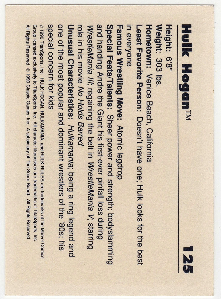Lot of 6 – Hulk Hogan 1990 Classic WWF Wrestling Trading Card #1. This lot consist of 6 of the Hulk Hogan 1990 Classic WWF Wrestling Trading Card #125. All cards are in good condition.