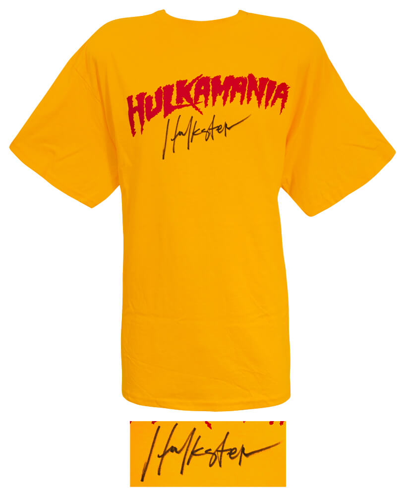 Hulk Hogan signed Hulkamania yellow wrestling t-shirt with ‘Hulkster’ signature. Item comes with a Schwartz Sports Memorabilia tamper-proof numbered hologram and Certificate of Authenticity which can be verified online.
