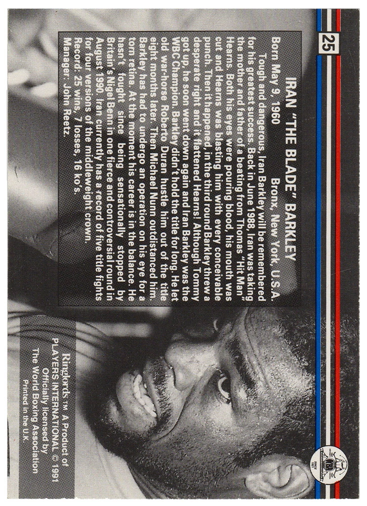 Iran Barkley signed 1991 Ringlords Boxing trading card #25. Item comes with a Schwartz Sports Memorabilia tamper-proof numbered hologram (on back of physical card) and Certificate of Authenticity which can be verified online.