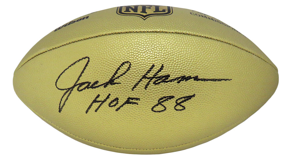 Jack Ham signed Wilson Duke gold metallic NFL full size replica football with ‘HOF 88’ inscription. Item comes with a Schwartz Sports Memorabilia tamper-proof numbered hologram and Certificate of Authenticity which can be verified online.