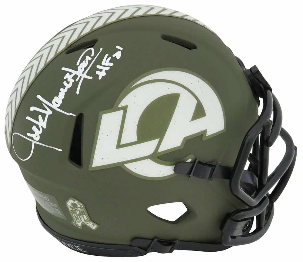 Jack Youngblood signed Los Angeles Rams Salute to Service Riddell speed mini helmet with ‘HF 01″ inscription. Item comes with a Schwartz Sports Memorabilia tamper-proof numbered hologram and Certificate of Authenticity which can be verified online.