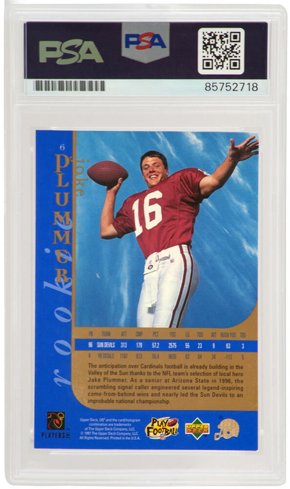 Jake Plummer signed Arizona Cardinals 1997 Upper Deck rookie football trading card #6 with ‘Snake’ inscription. The card has been authenticated and encapsulated by PSA/DNA and the number can be verified online.