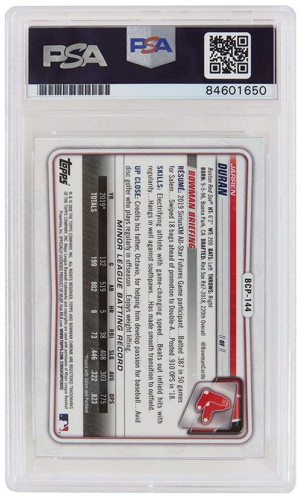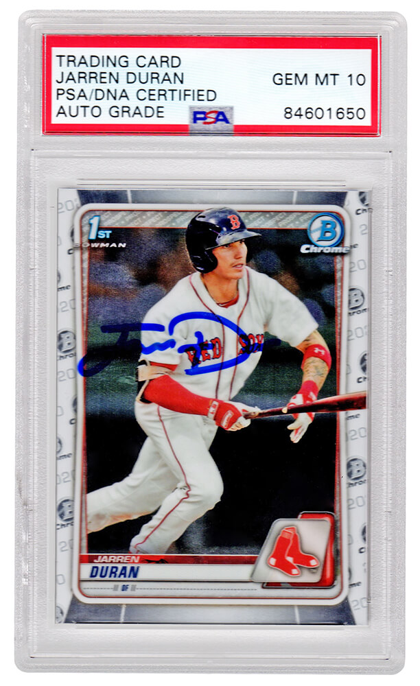 Jarren Duran Signed Boston Red Sox 2020 Topps Bowman Chrome baseball rookie card #BCP-144. The card has been authenticated and encapsulated by PSA/DNA and the autograph has been given a GEM Mint 10 auto grade. The authentication number can be verified online. Only the autograph has been graded a 10 by PSA, the card itself is ungraded. The image of the item is a stock photo, as we may have multiples of the item in stock. The Slabbed Card you will receive will be of the card described. (Same grade, Same authentication) You may or may not receive the exact PSA serial number on the slab label shown in image.