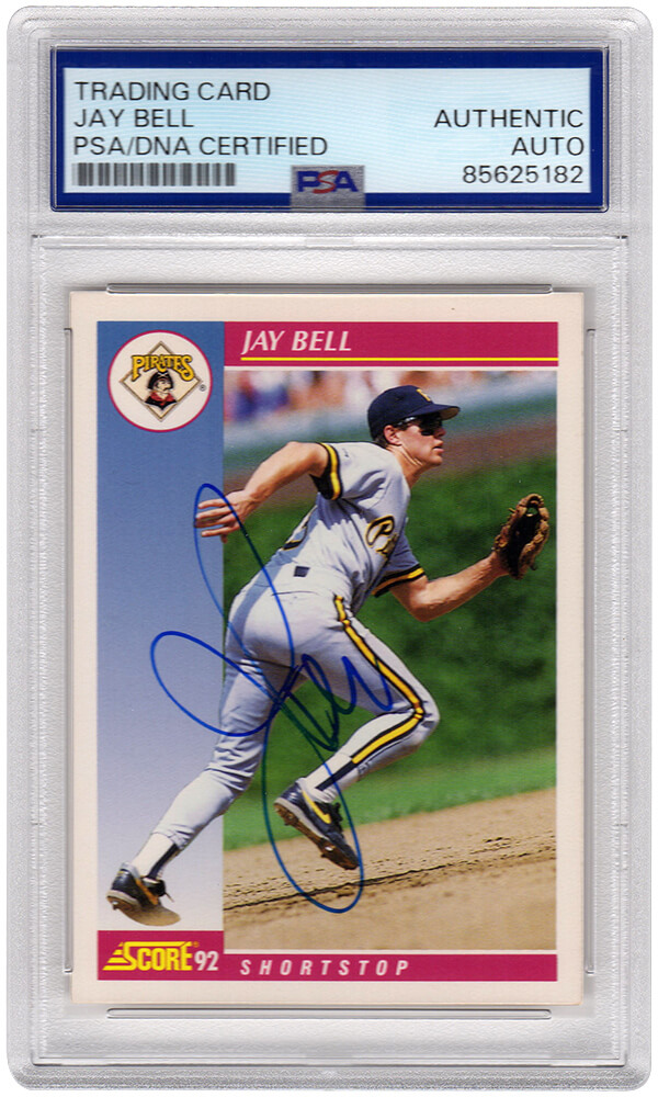 Jay Bell signed Pirates baseball trading card (various cards). The card has been authenticated and encapsulated by PSA and the authentication number can be verified online.