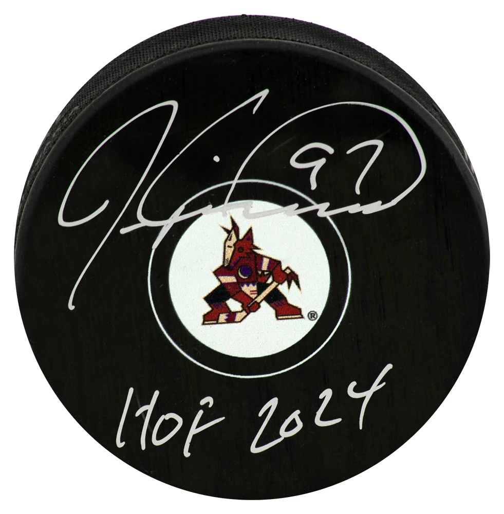 Jeremy Roenick signed Arizona Coyotes logo hockey puck with ‘HOF 2024’ inscription. Item comes with a Schwartz Sports Memorabilia tamper-proof numbered hologram and Certificate of Authenticity which can be verified online.