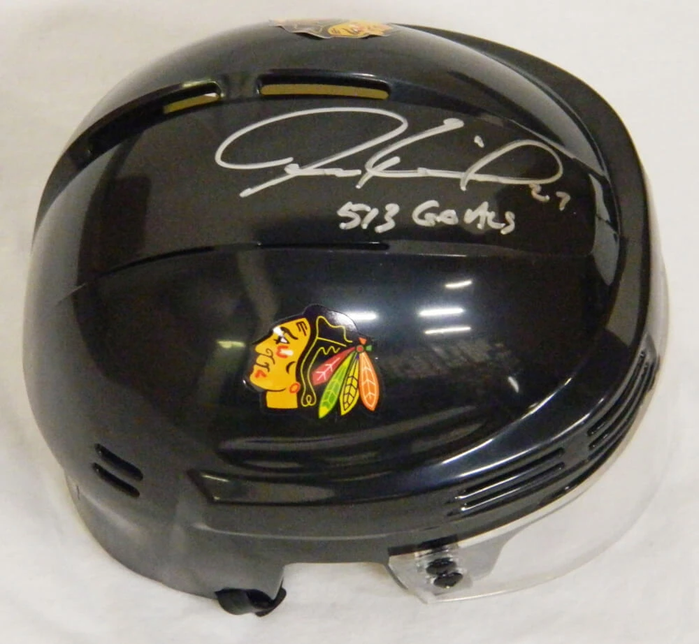 Jeremy Roenick signed Chicago Blackhawks black hockey mini helmet with ‘513 Goals’ inscription. Item comes with a Schwartz Sports Memorabilia tamper-proof numbered hologram and Certificate of Authenticity which can be verified online.