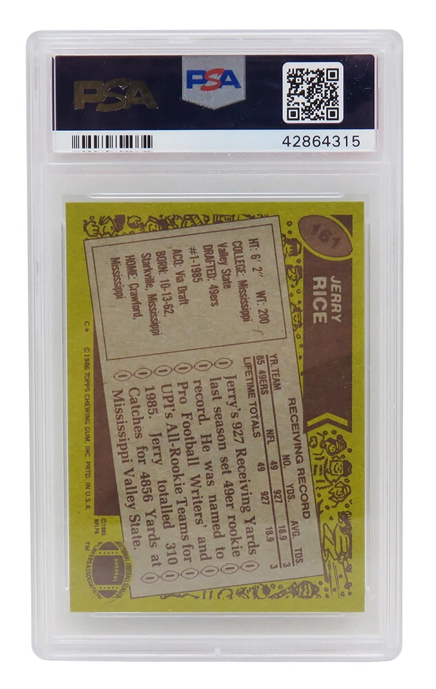 This is for one (1) Jerry Rice San Francisco 49ers 1986 Topps football #161 rookie card, which has been encapsulated and graded Mint 9 by PSA. You will receive the card shown with PSA #42864315