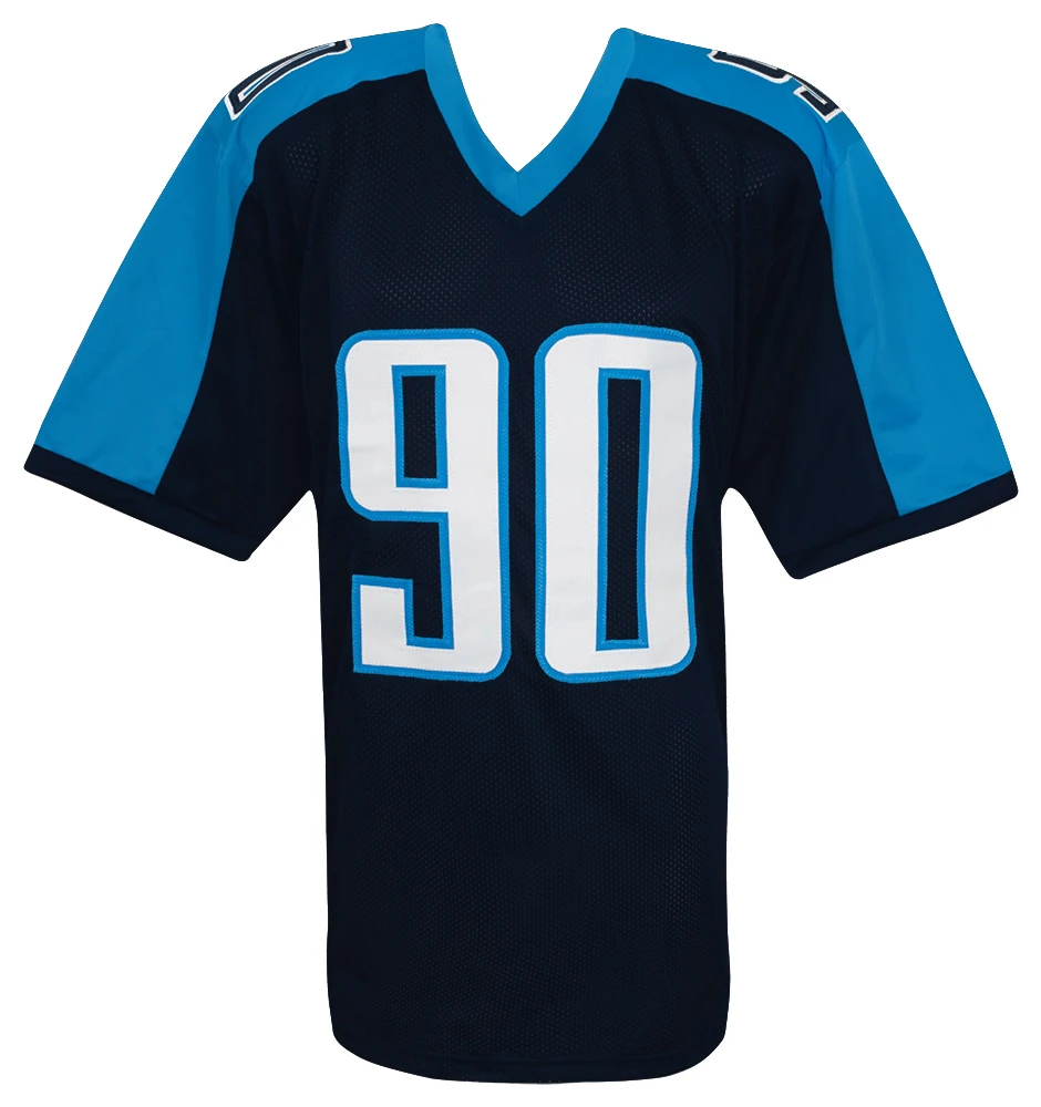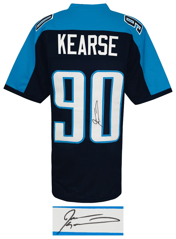 Jevon Kearse signed blue throwback custom football jersey. Item comes with a Schwartz Sports Memorabilia tamper-proof numbered hologram and Certificate of Authenticity which can be verified online. Jersey is size XL.