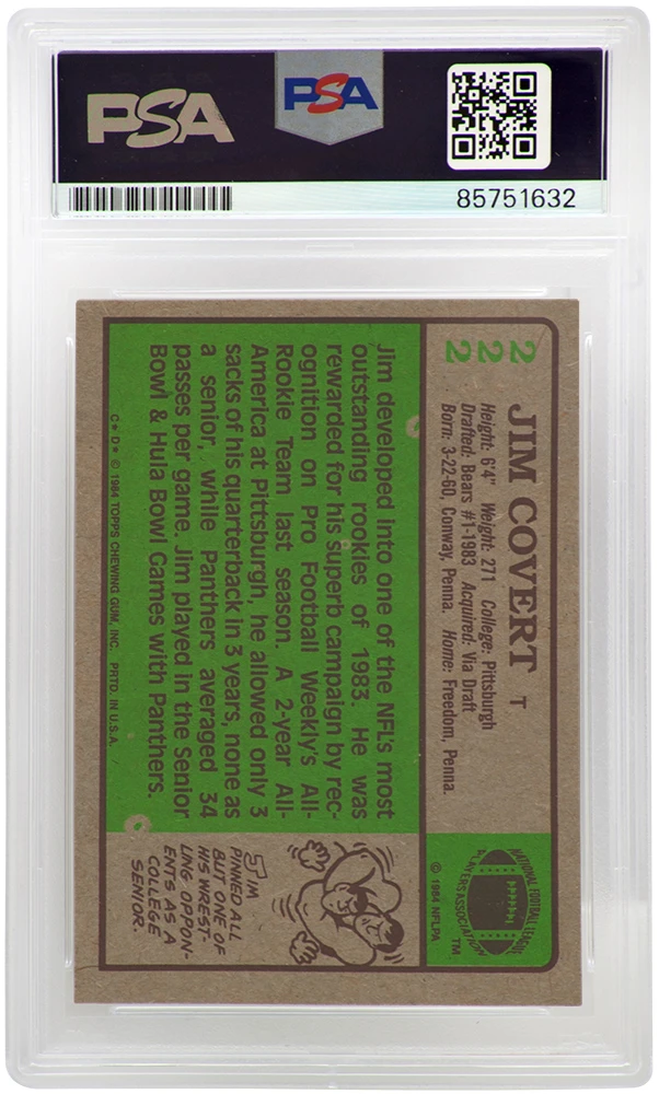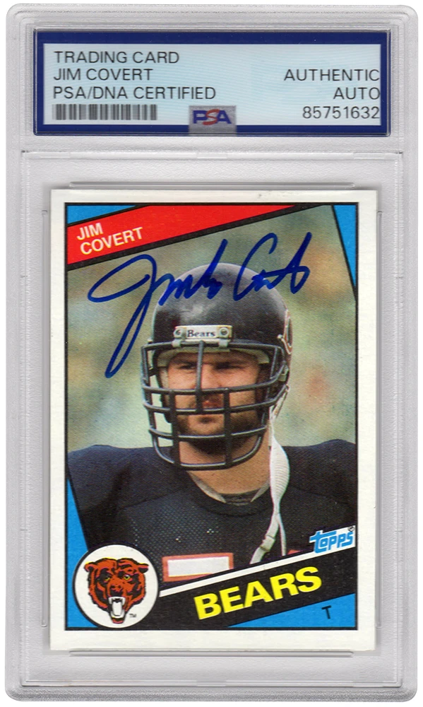 Jim Covert signed Chicago Bears 1984 Topps rookie football trading card #222. The card has been authenticated and encapsulated by PSA/DNA and the number can be verified online.