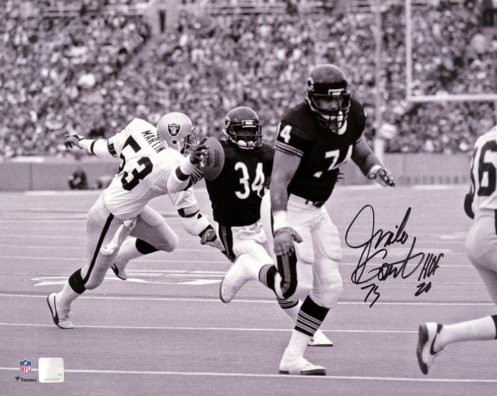 Jim Covert signed Chicago Bears black and white action 16×20 photo with ‘HOF 20’ inscription. Item comes with a Schwartz Sports Memorabilia tamper-proof numbered hologram and Certificate of Authenticity which can be verified online.