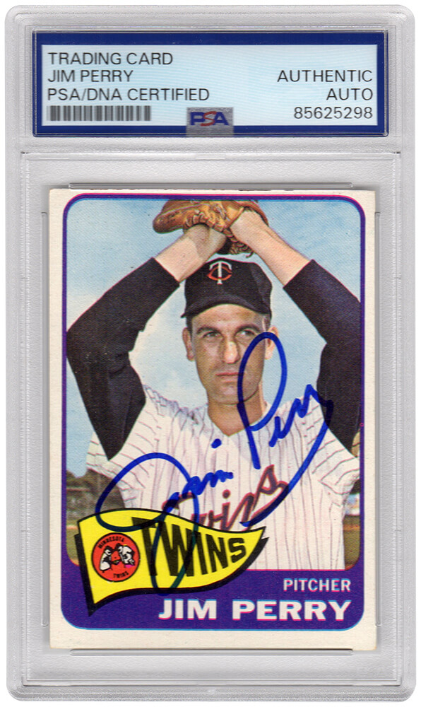Jim Perry signed Twins baseball trading card (various cards). The card has been authenticated and encapsulated by PSA and the authentication number can be verified online.