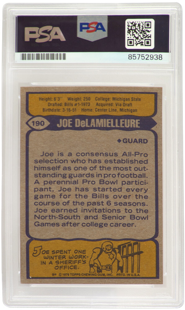 Joe DeLamielleure signed Buffalo Bills 1979 Topps football trading card #190 with ‘HOF 03’ inscription. The card has been authenticated and encapsulated by PSA/DNA and the number can be verified online.