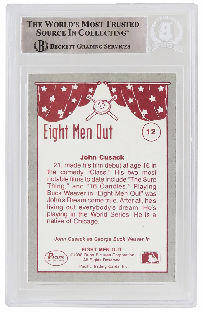 John Cusack Signed 1988 Pacific Eight Men Out trading card #12. The card has been authenticated and encapsulated by Beckett Authentic and the authentication number can be verified online. The image of the item is a stock photo, as we may have multiples of the item in stock. The Slabbed Card you will receive will be of the card described. (Same grade, Same authentication) You may or may not receive the exact Beckett serial number on the slab label shown in image.