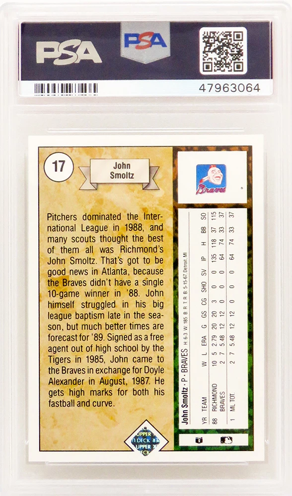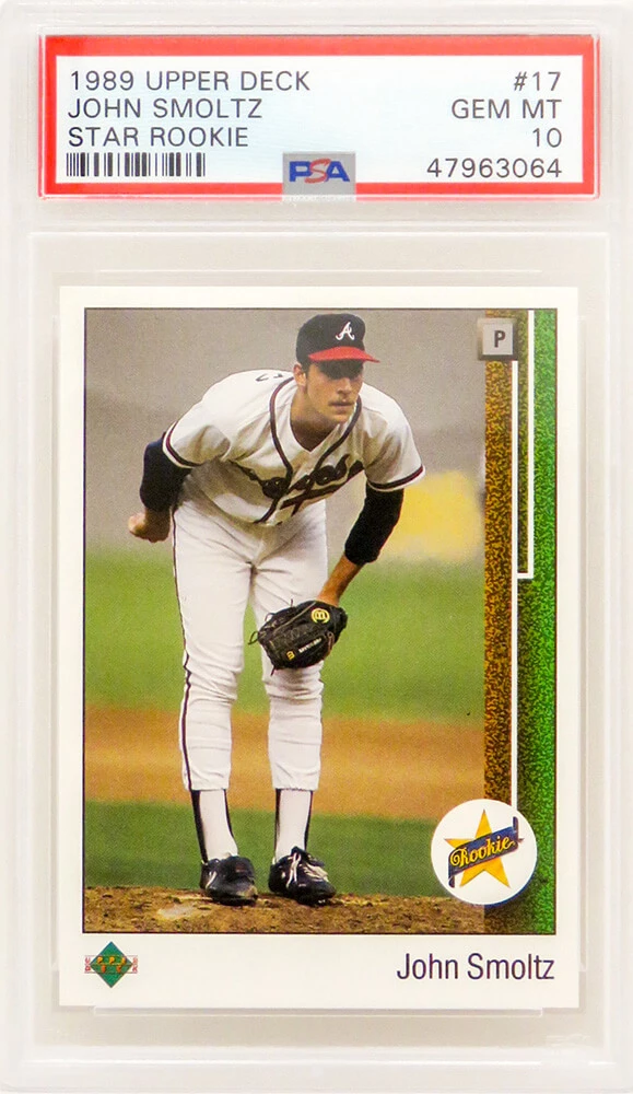 This is for one (1) John Smoltz Atlanta Braves 1989 Upper Deck baseball #17 RC rookie card, which has been encapsulated and graded Gem Mint 10 by PSA, the highest grade available for this Mint condition card. We have more than one of this Graded Card in stock in the same PSA grade. We have included a stock photo for this item and the Graded Card you will receive will be of the card described, with the same grade as shown. You may or may not receive the exact PSA serial number on the slab label shown in image.