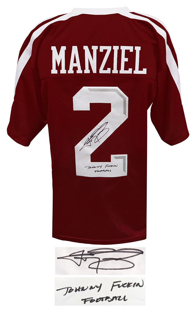 Johnny Manziel signed maroon custom college football jersey with ‘Johnny F*^ckin Football’ inscription. Item comes with a Schwartz Sports Memorabilia tamper-proof numbered hologram and Certificate of Authenticity which can be verified online.