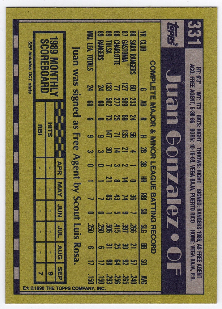 Juan Gonzalez signed Texas Rangers 1990 Topps rookie baseball card #331 with ‘2x MVP’ inscription. Item comes with a Schwartz Sports Memorabilia tamper-proof numbered hologram (on back of physical card) and Certificate of Authenticity which can be verified online.