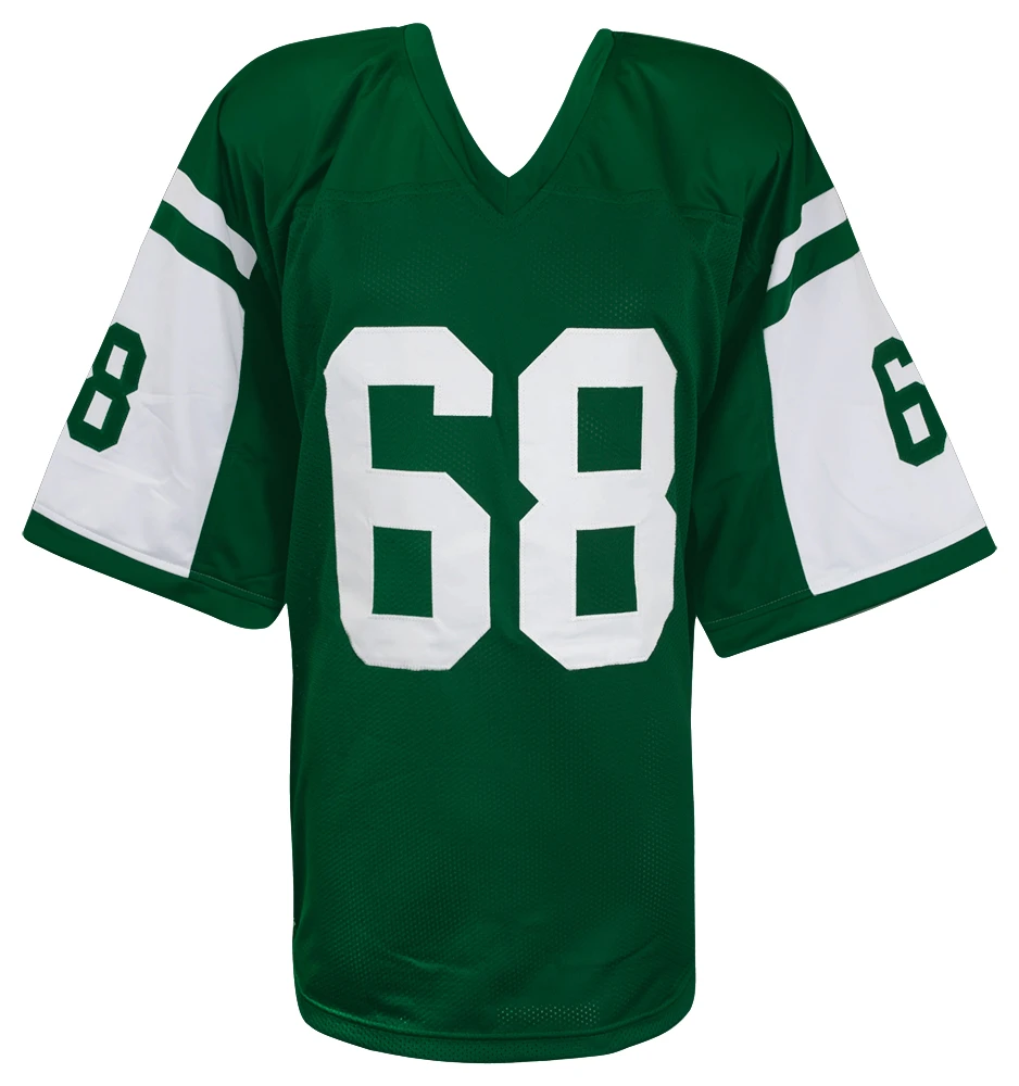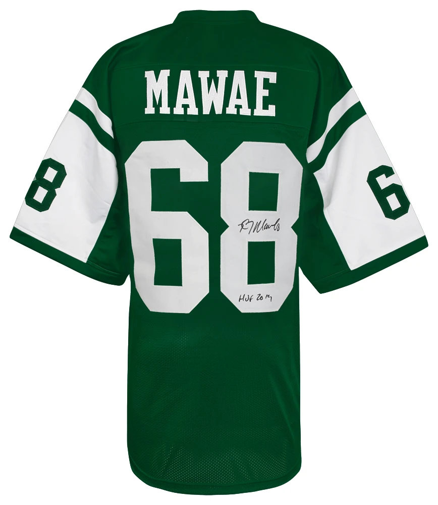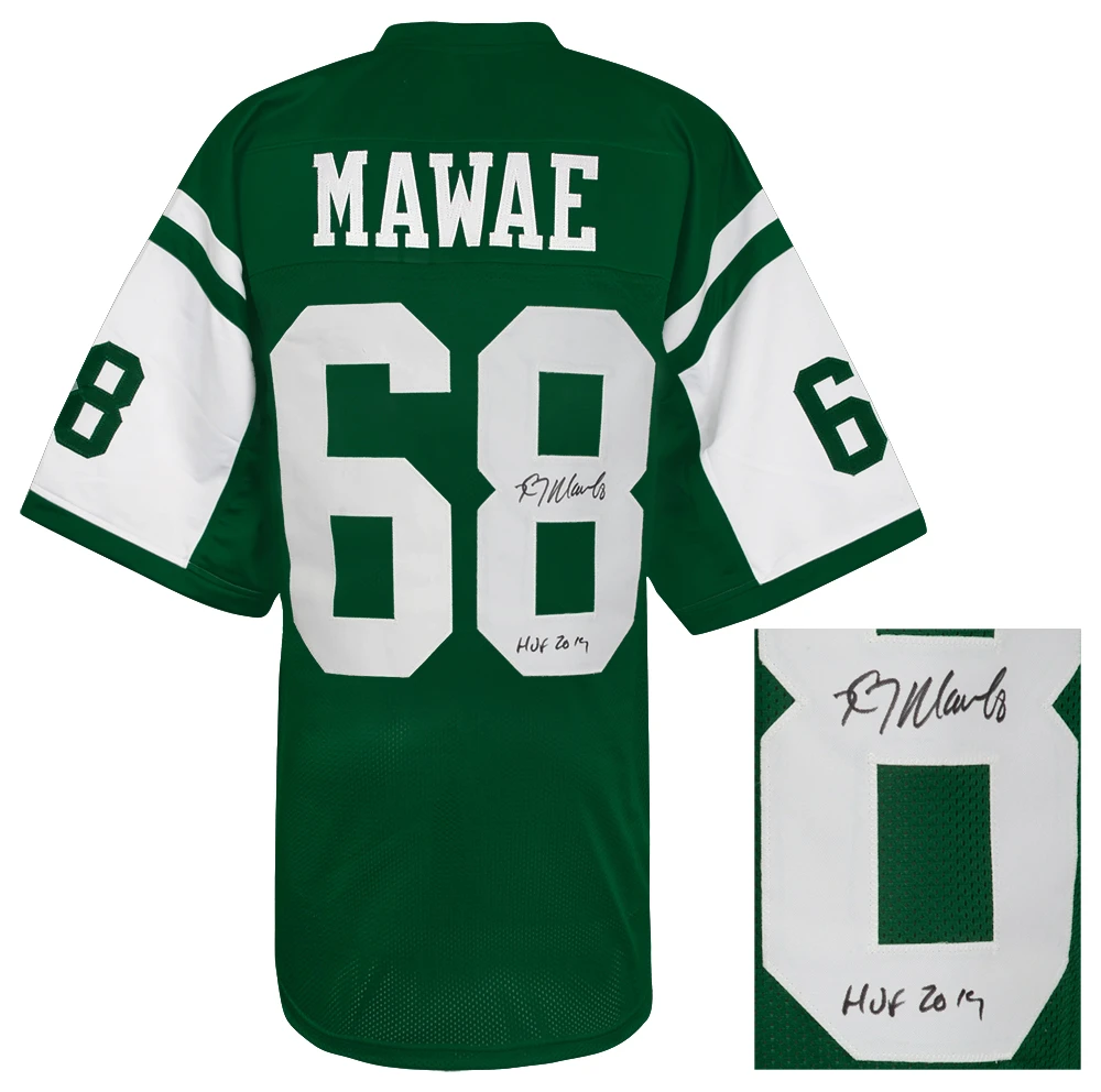 Kevin Mawae signed green throwback custom football jersey with ‘HOF 2019’ inscription. Item comes with a Schwartz Sports Memorabilia tamper-proof numbered hologram and Certificate of Authenticity which can be verified online. Jersey is size XL.