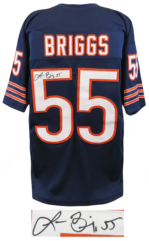 Lance Briggs signed navy custom football jersey. Item comes with a Schwartz Sports Memorabilia tamper-proof numbered hologram and Certificate of Authenticity which can be verified online. Jersey is size XL.
