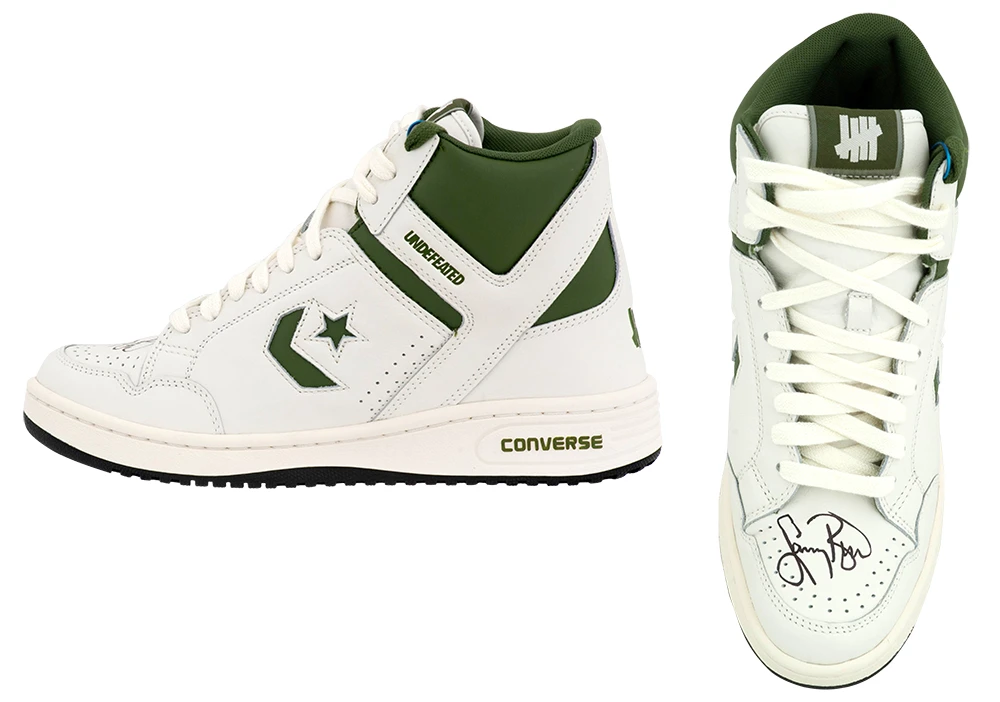 Larry Bird signed Converse X Undefeated Weapons white and green men’s basketball left foot shoe. This is for only the signed left foot shoe which is size adult men’s 8.5. Item comes with the Larry Bird peronal tamper-proof hologram and Schwartz Sports Memorabilia tamper-proof numbered hologram which can be verified online.
