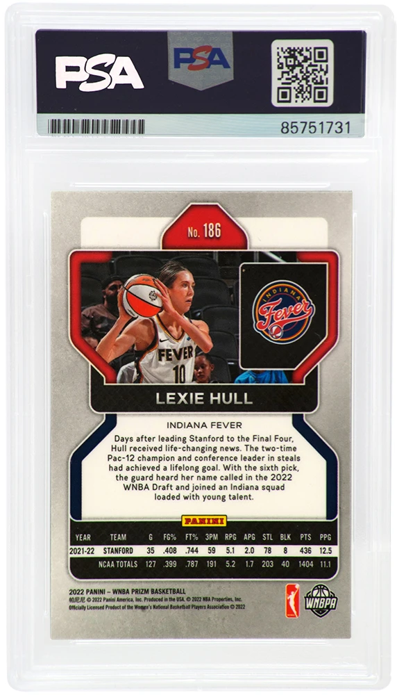 Lexie Hull signed Indiana Fever 2022 Panini Prizm WNBA rookie basketball card #186. The card has been authenticated and encapsulated by PSA and the authentication number can be verified online.