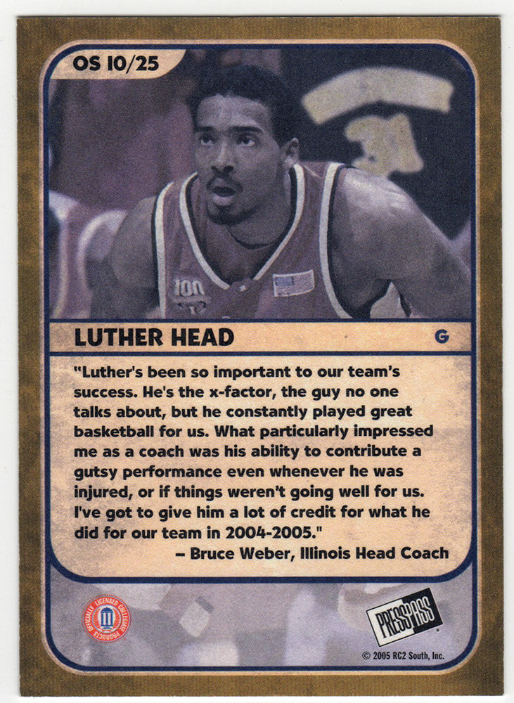 Luther Head signed Illinois Fighting Illini 2005 Press Pass Old School rookie basketball card #10. Item comes with a Schwartz Sports Memorabilia tamper-proof numbered hologram (on back of physical card) and Certificate of Authenticity which can be verified online.