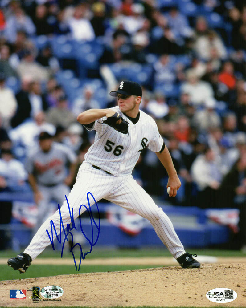 Mark Buehrle signed Chicago White Sox white pinstripe jersey pitching action 8×10 photo. Item comes with a JSA (James Spence Authentication) tamper evident numbered sticker which can be verified online.