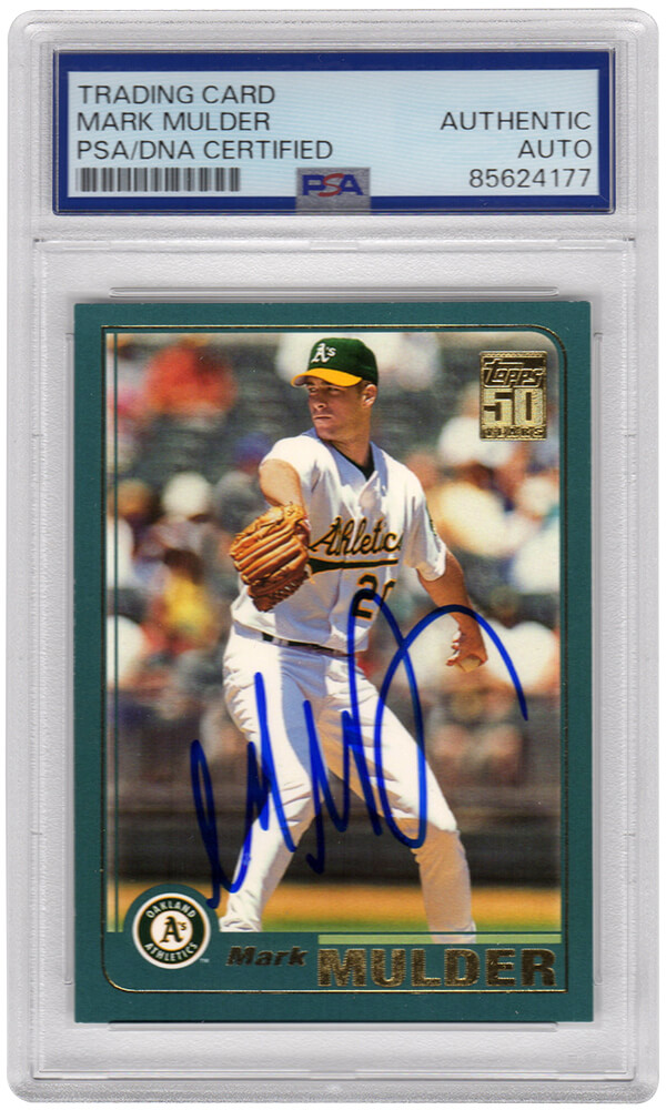 Mark Mulder signed A’s baseball trading card (various cards). The card has been authenticated and encapsulated by PSA and the authentication number can be verified online.