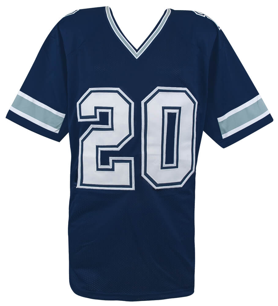 Mel Renfro signed navy custom football jersey with ‘HOF 96’ inscription. Item comes with a Schwartz Sports Memorabilia tamper-proof numbered hologram and Certificate of Authenticity which can be verified online. Jersey is size XL.