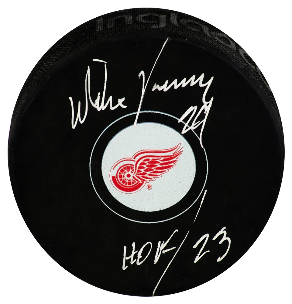 Mike Vernon signed Detroit Red Wings logo hockey puck with ‘HOF 2023’ inscription. Item comes with a Schwartz Sports Memorabilia tamper-proof numbered hologram and Certificate of Authenticity which can be verified online.