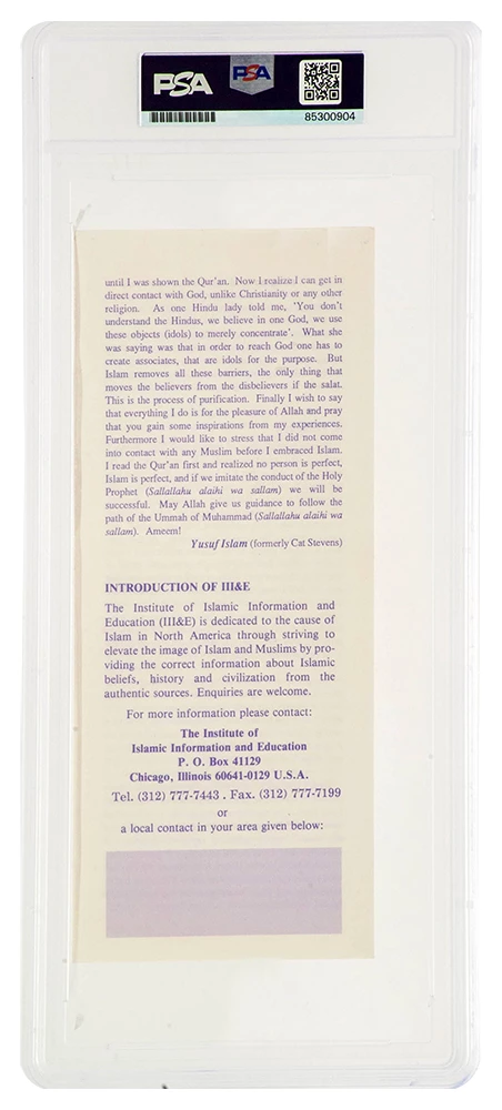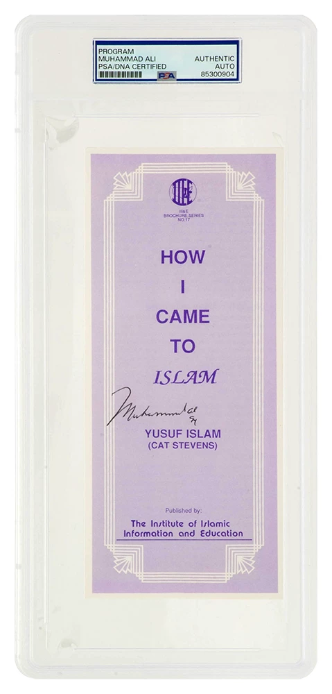 Muhammad Ali signed Islamic ‘How I Came To Islam’ brochure series no.17 purple 3×8 pamplet. The encapsulation is an overall size of 6×12 inches. The pamplet has been authenticated and encapsulated by PSA/DNA and the authentication number can be verified online.