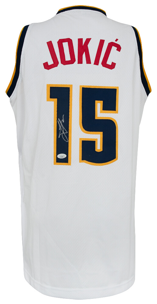 Nikola Jokic signed white custom basketball jersey. Item comes with a JSA (James Spence Authentication) tamper evident numbered sticker and matching Certificate of Authenticity which can be verified online.
