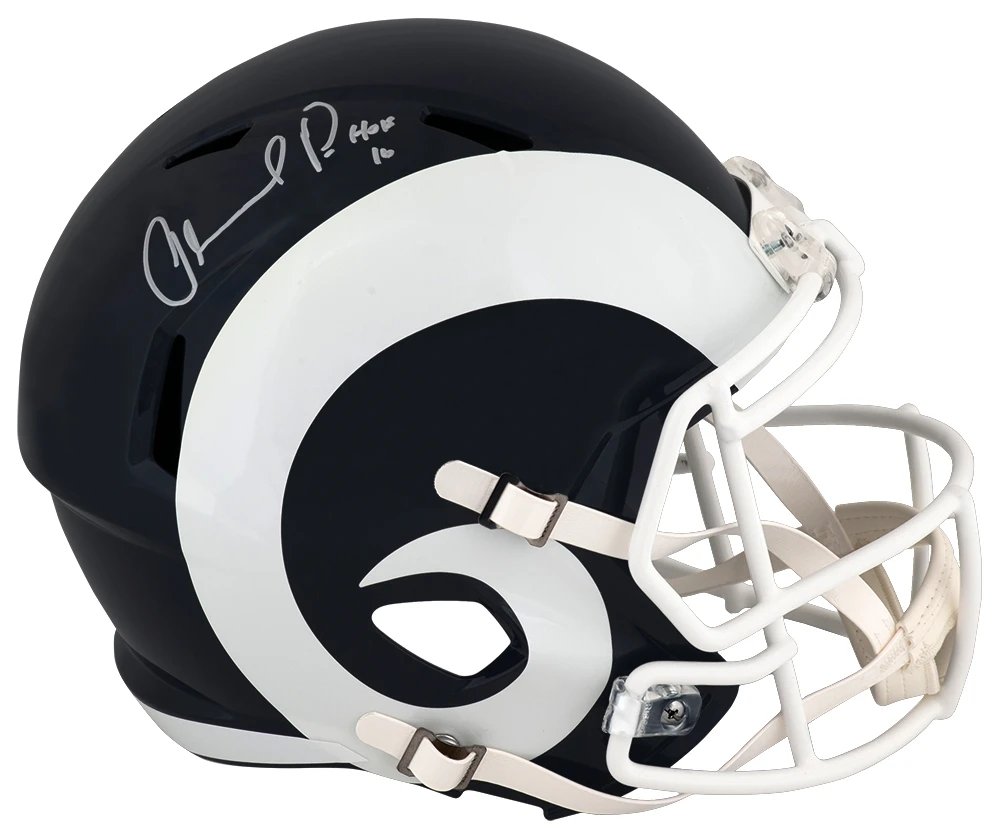 Orlando Pace signed Rams (2017-2019 style) white horn Riddell full size speed replica helmet with ‘HOF 16’ inscription. Item comes with a Schwartz Sports Memorabilia tamper-proof numbered hologram and Certificate of Authenticity which can be verified online.