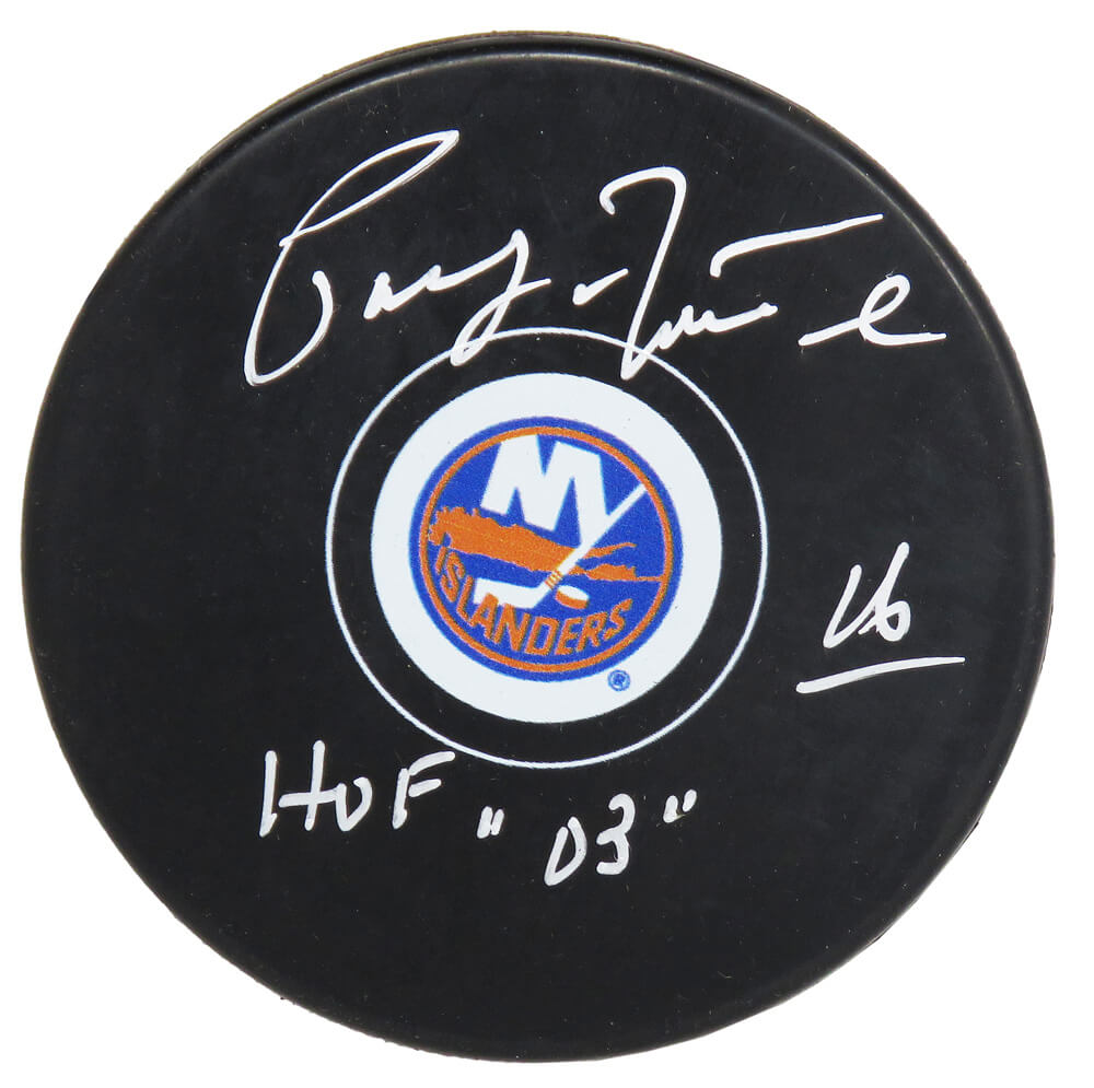Pat LaFontaine signed New York Islanders logo hockey puck with ‘HOF 03’ inscription. Item comes with a Schwartz Sports Memorabilia tamper-proof numbered hologram and Certificate of Authenticity which can be verified online.