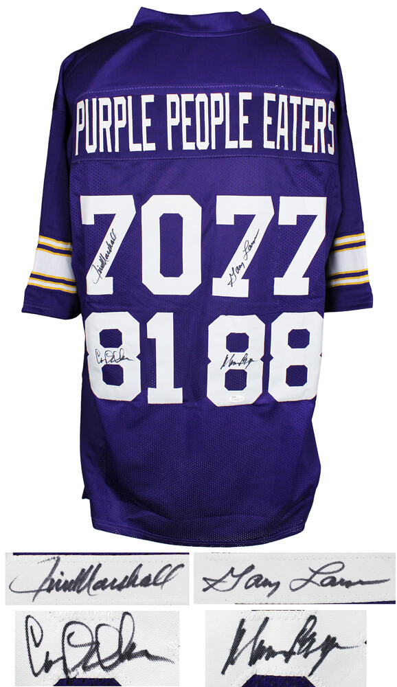 Purple People Eaters signed purple custom throwback jersey. Jersey has four sets of numbers to represent each member and the name plate Purple People Eaters. The jersey is signed by Alan Page, Carl Eller, Jim Marshall and Gary Larsen. Item comes with a JSA (James Spence Authentication) tamper evident numbered sticker and matching Certificate of Authenticity which can be verified online. Jersey is size XL.