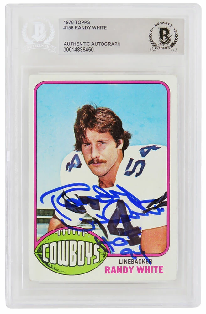 Randy White signed Dallas Cowboys 1976 Topps rookie football trading card #158 with ‘HOF’94’ inscription. The card has been authenticated and encapsulated by Beckett Authentic and the authentication number can be verified online. The image of the item is a stock photo, as we may have multiples of the item in stock. The Slabbed Card you will receive will be of the card described. (Same grade, Same authentication) You may or may not receive the exact Beckett serial number on the slab label shown in image.