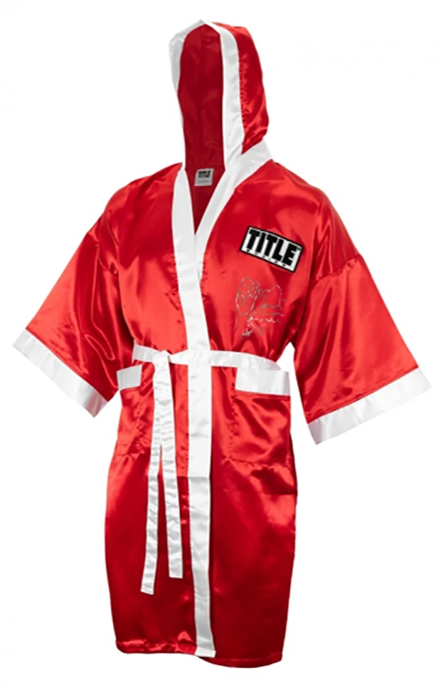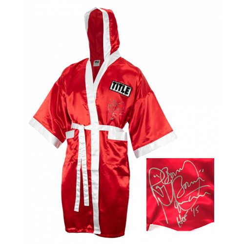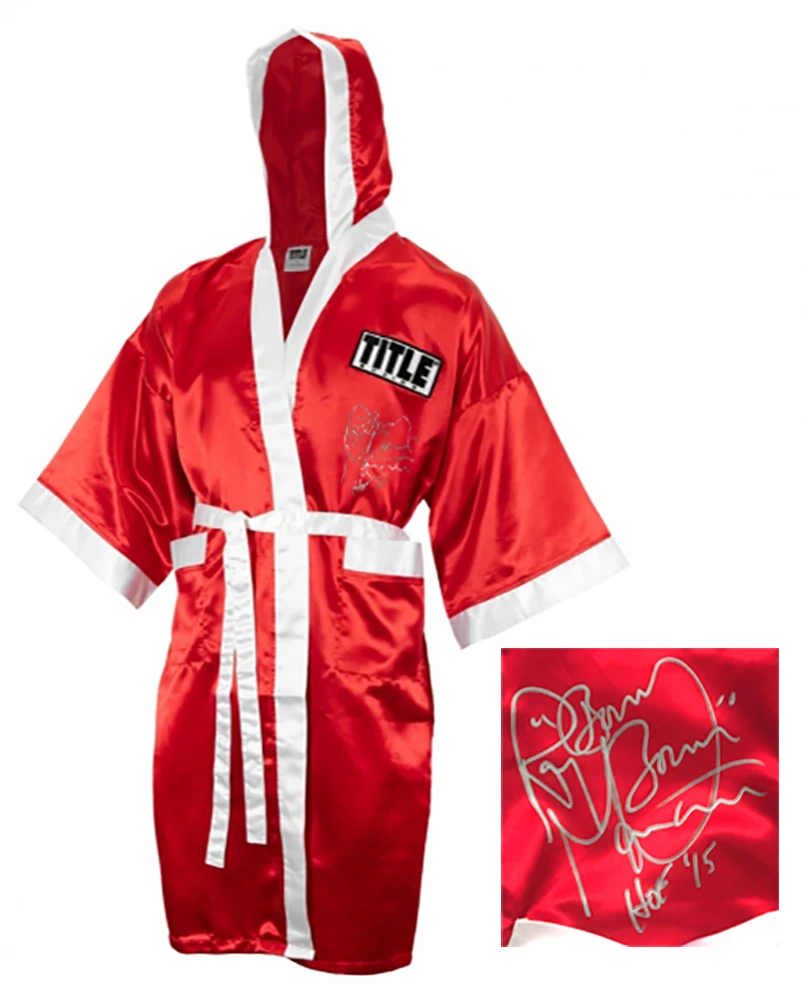 Ray Mancini signed Title red and white boxing robe with ‘Boom Boom’ and ‘HOF 15’ inscriptions. Item comes with a Schwartz Sports Memorabilia tamper-proof numbered hologram and Certificate of Authenticity which can be verified online.