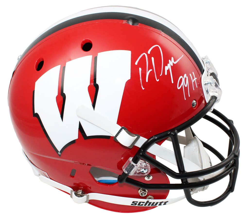Ron Dayne signed Wisconsin Badgers red Schutt full size replica helmet with ’99H’ inscription. Item comes with a Schwartz Sports Memorabilia tamper-proof numbered hologram and Certificate of Authenticity which can be verified online.