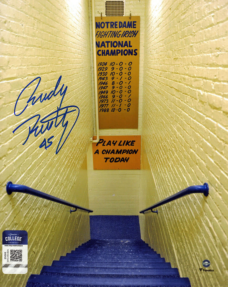 Rudy Ruettiger signed Notre Dame Fighting Irish Play Like A Champion Today 8×10 photo. Item comes with a Schwartz Sports Memorabilia tamper-proof numbered hologram and Certificate of Authenticity which can be verified online.