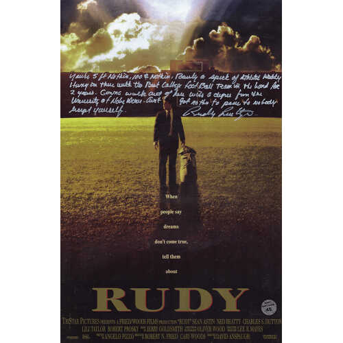 Rudy Ruettiger signed Rudy 11×17 movie poster with Youre 5 ft nothin, a hundred and nothin, barely a speck of athletic ability, hung in there with the best college football team in the land for 2 years, Gonna walk out of here with a degree from the University of Notre Dame. In this lifetime, anit got nothing to prove to nobody, except yourself. movie quote inscription. Item comes with a Schwartz Sports Memorabilia tamper-proof numbered hologram and Certificate of Authenticity which can be verified online. Item comes with a Schwartz Sports Memorabilia tamper-proof numbered hologram and Certificate of Authenticity which can be verified online.