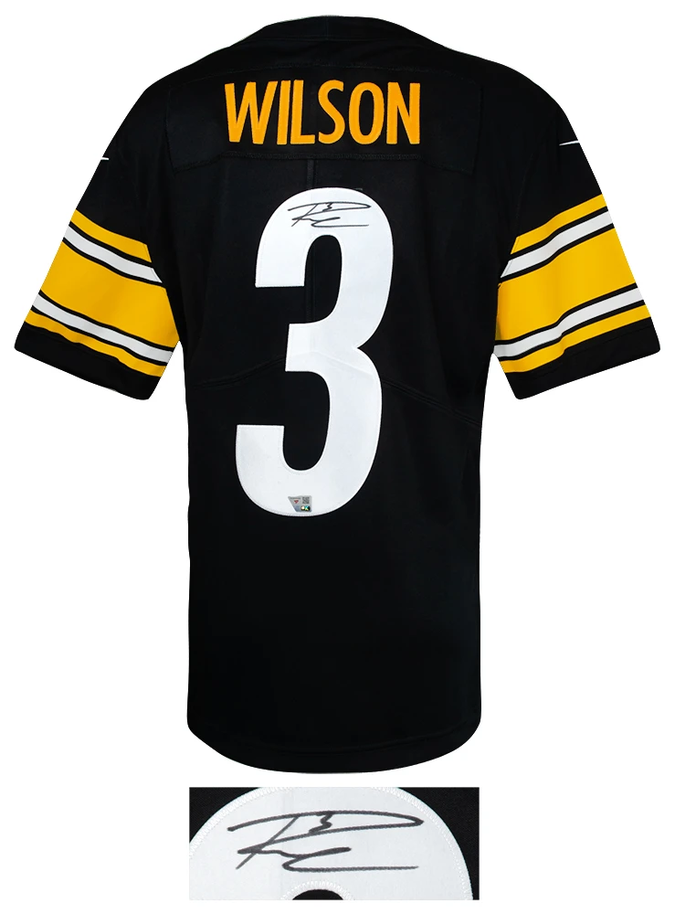 Russell Wilson signed Pittsburgh Steelers Nike black replica football jersey. Item comes with a Fanatics Authentic tamper-proof numbered hologram and Certificate of Authenticity which can be verified online.