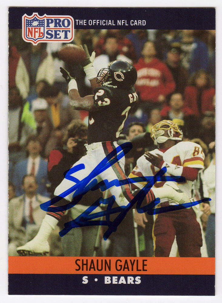 Shaun Gayle signed Chicago Bears 1990 Pro-Set rookie football trading card #450. Item comes with a Schwartz Sports Memorabilia tamper-proof numbered hologram (on back of physical card) and Certificate of Authenticity which can be verified online.