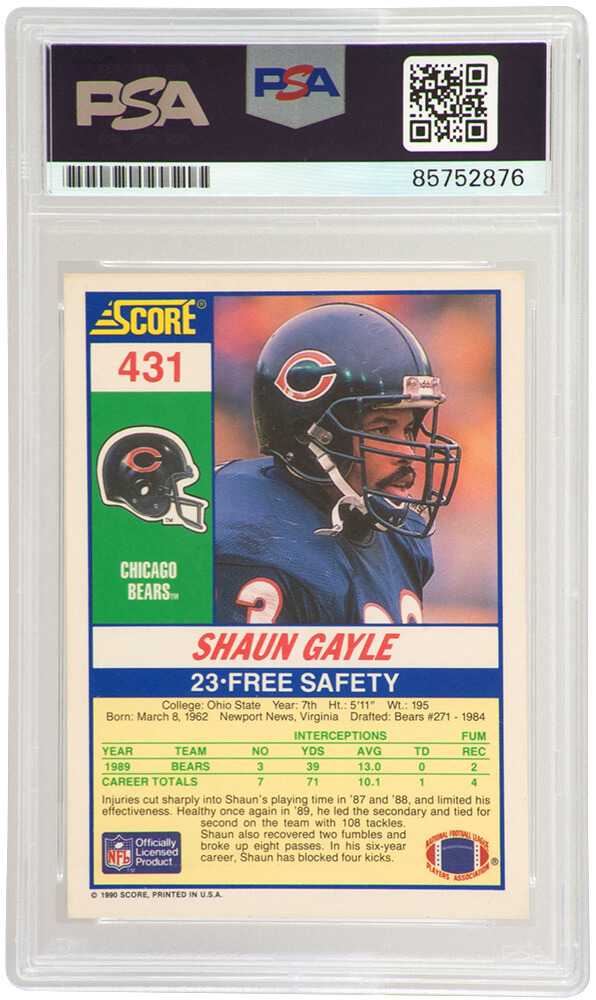 Shaun Gayle signed Chicago Bears 1990 Score rookie football trading card #431. The card has been authenticated and encapsulated by PSA/DNA and the number can be verified online.
