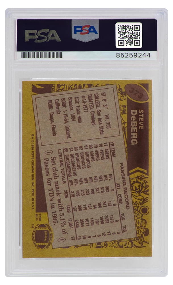 Steve Deberg signed Tampa Bay Buccaneers 1986 Topps football trading card #373. The card has been authenticated and encapsulated by PSA/DNA and the number can be verified online.