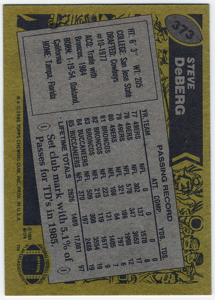Steve Deberg signed Tampa Bay Buccaneers 1986 Topps football trading card #373. Item comes with a Schwartz Sports Memorabilia tamper-proof numbered hologram (on back of physical card) and Certificate of Authenticity which can be verified online.