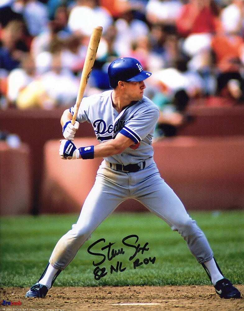 Steve Sax Signed Los Angeles Dodgers Batting Action 8×10 Photo w/82 NL ROY