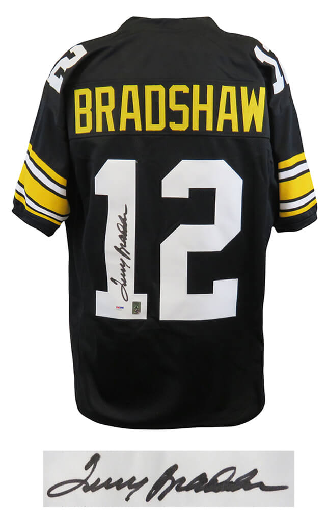 Terry Bradshaw signed black custom football jersey. Item comes with a PSA/DNA tamper evident numbered sticker and matching Certificate of Authenticity which can be verified online.