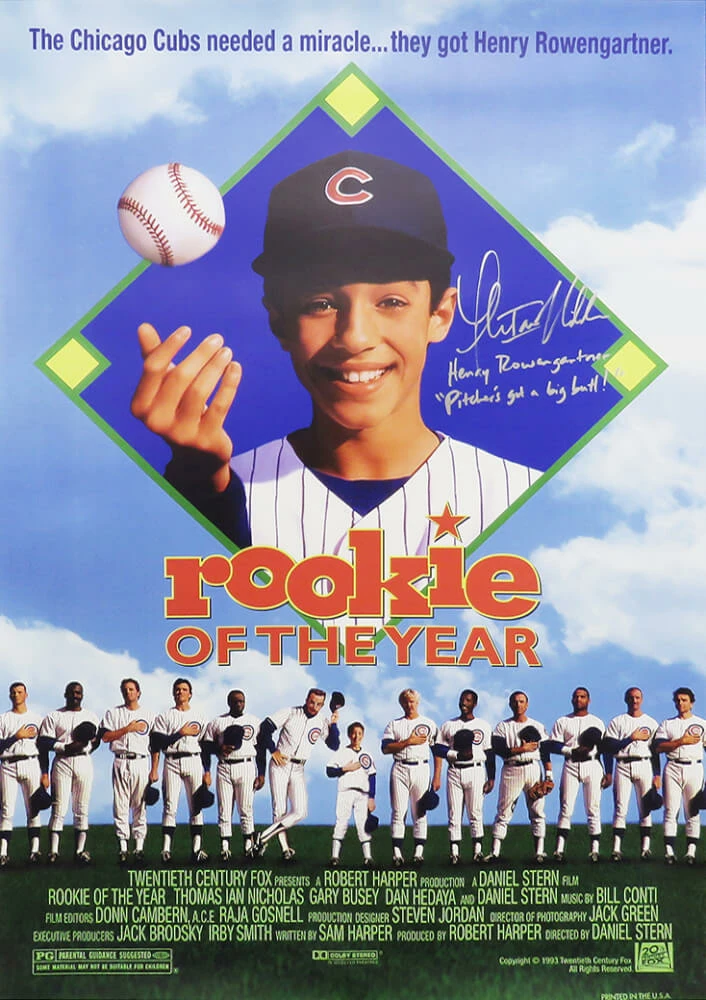 Thomas Ian Nicholas signed Rookie of the Year 27×40 full size movie poster with ‘Henry Rowengartner’ and ‘Pitchers Got A Big Butt!’ inscriptions. Item comes with a Schwartz Sports Memorabilia tamper-proof numbered hologram and Certificate of Authenticity which can be verified online.