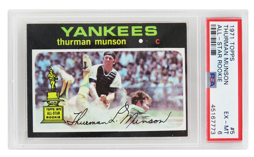 This is for one (1) Thurman Munson New York Yankees 1971 Topps All Star Rookie (2nd year) baseball card #5, which has been encapsulated and graded EX-MT (Excellent Mint) 6 by PSA. You will receive the card shown with PSA #45167773.